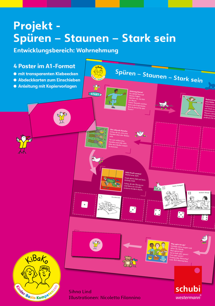 Inhalt: 4 Poster Staunen – Spüren – Stark sein • 64 transparente Klebeecken • 8 Abdeckkarten • 32 Seiten Anleitung mit Praxisideen zu den Aufgabenfeldern und Informationen zur Bedeutung der Basissinne • 5 Kopiervorlagen