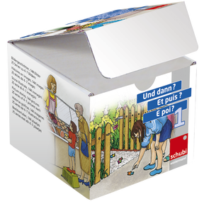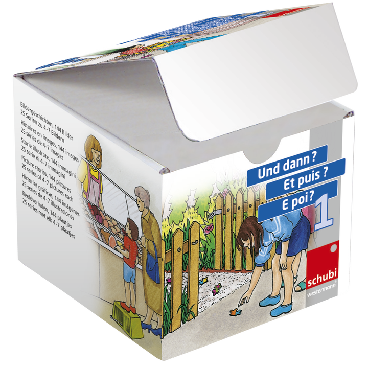 Inhalt: 25 Geschichten mit je 5-7 Bildern und 5 Fragezeichenkarten, insgesamt 143 Karten 10 x 9,5 cm.